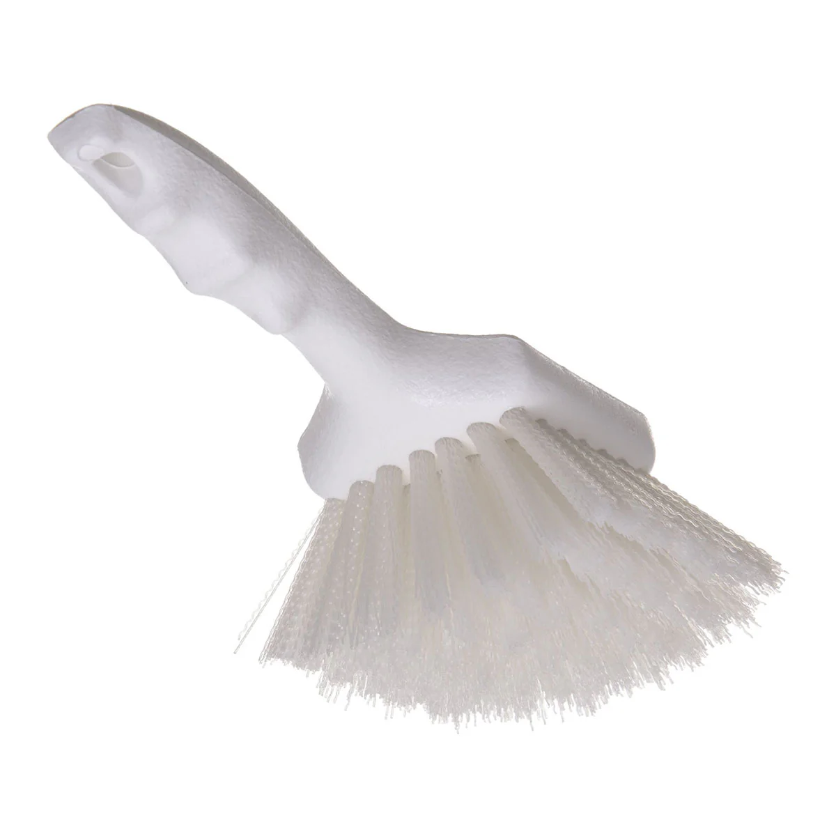 Ideal for tough kitchen scrubbing and other difficult jobs, this virtually unbreakable Carlisle 4054102 Flo-Pac White Utility Scrub Brush is able to withstand these duties. This 8-1/2-inch handled brush features crimped polyester bristles. Maintain your establishment the right way with this brush. Pistol grip handle and bristles are designed to work in the most comfortable positions and provide the most efficient cleaning. Plastic handle is lightweight, break resistant and "soak proof". BPA Free. Made in USA